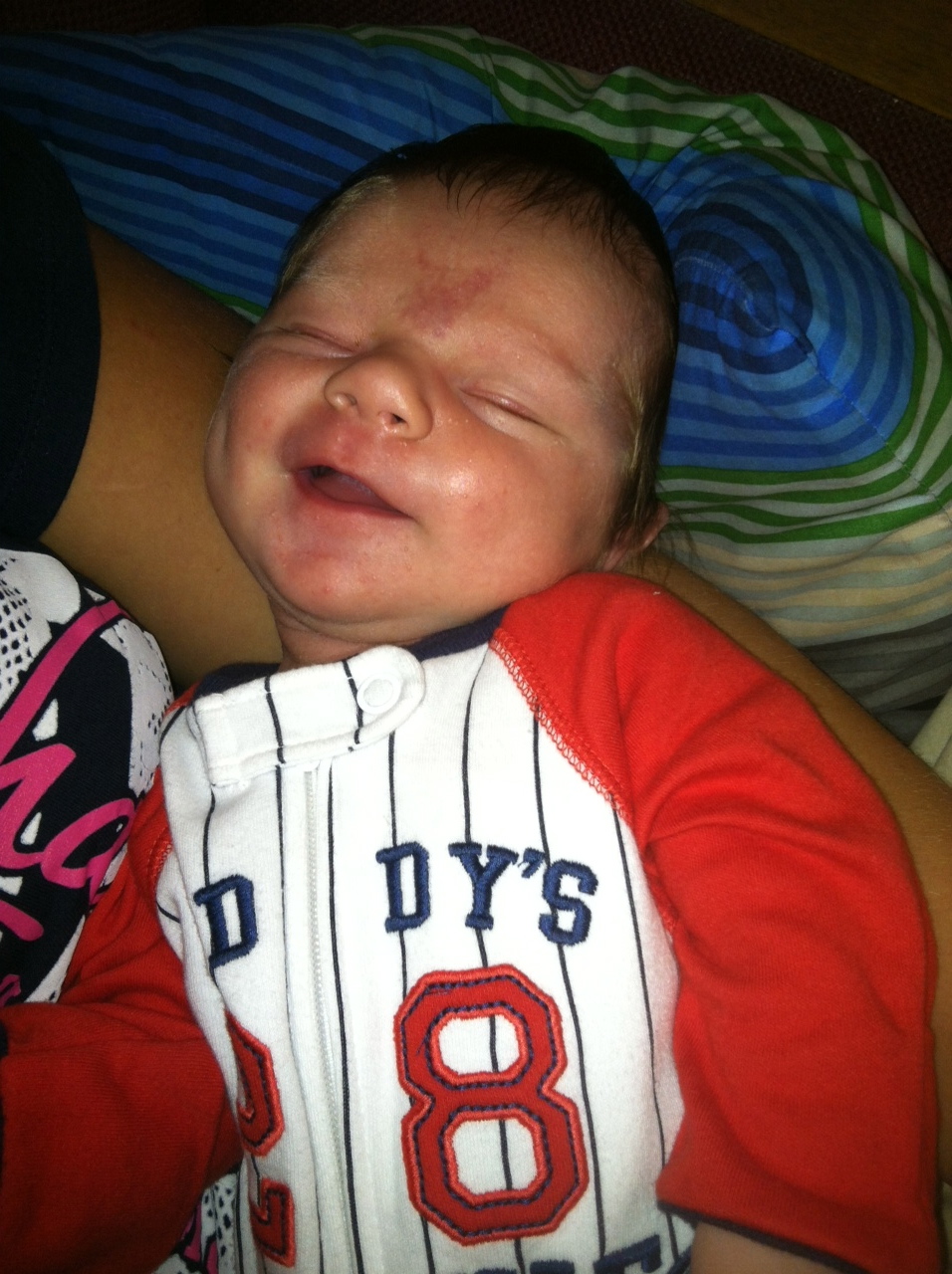 Tricks: Dax has started to smile more then just the sleepy smiles. We can usually get him to do it in the morning. He has also started to co a little bit. He is starting to be more observant and I think he knows who his mommy and daddy are!